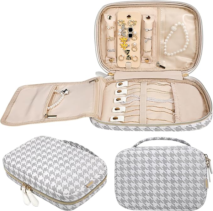 / Voova Travel Jewelry Holder Organizer Case, Large Traveling Jewelry Storage Book Bag for Women Girls, Portable Jewellery Roll Pouch Folio for Necklaces, Rings, Earrings, Bracelets, Watch, Grey+White